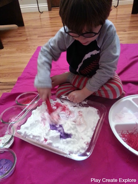 I set up a simple Valentine's Day shaving cream sensory activity using dollar store Valentine's swag, glitter, and powdered tempura paint (you could also use washable paint, food coloring, Kool-aid, or Duncan Hines Frosting Creations for color.) The point of this activity is really just good ole messy sensory play. My oldest has always loved mixing and making potions and concoctions, or pretend cooking with real ingredients, and so he really loved this!